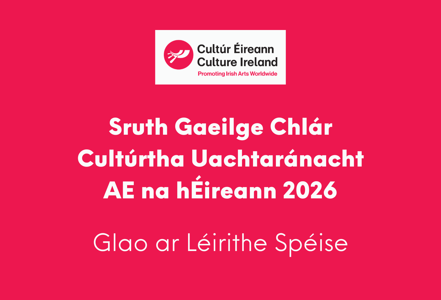 Tugann Cultúr Éireann cuireadh do léirithe spéise ó ealaíontóirí agus compántais chamchuairte Ghaeilge chun páirt a ghlacadh i gclár cultúrtha chun ceiliúradh a dhéanamh ar Uachtaránacht na hÉireann ar Chomhairle an Aontais Eorpaigh, a bheidh ar siúl sa dara leath de 2026. Mar chuid den tionscnamh seo, coimeádfaidh Cultúr Éireann clár dinimiciúil agus ardchaighdeáin d’ealaíona agus cultúr comhaimseartha na hÉireann,