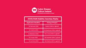 Is é meánoíche, an 1 Aibreán 2024 an chéad spriocdháta eile d’iarratais deontais. Caitear iarratas a dhéanamh ar mhaoiniú faoin dáta seo chun saothar a léiriú go hidirnáisiúnta ó lár mhí an Mheithimh ar aghaidh.